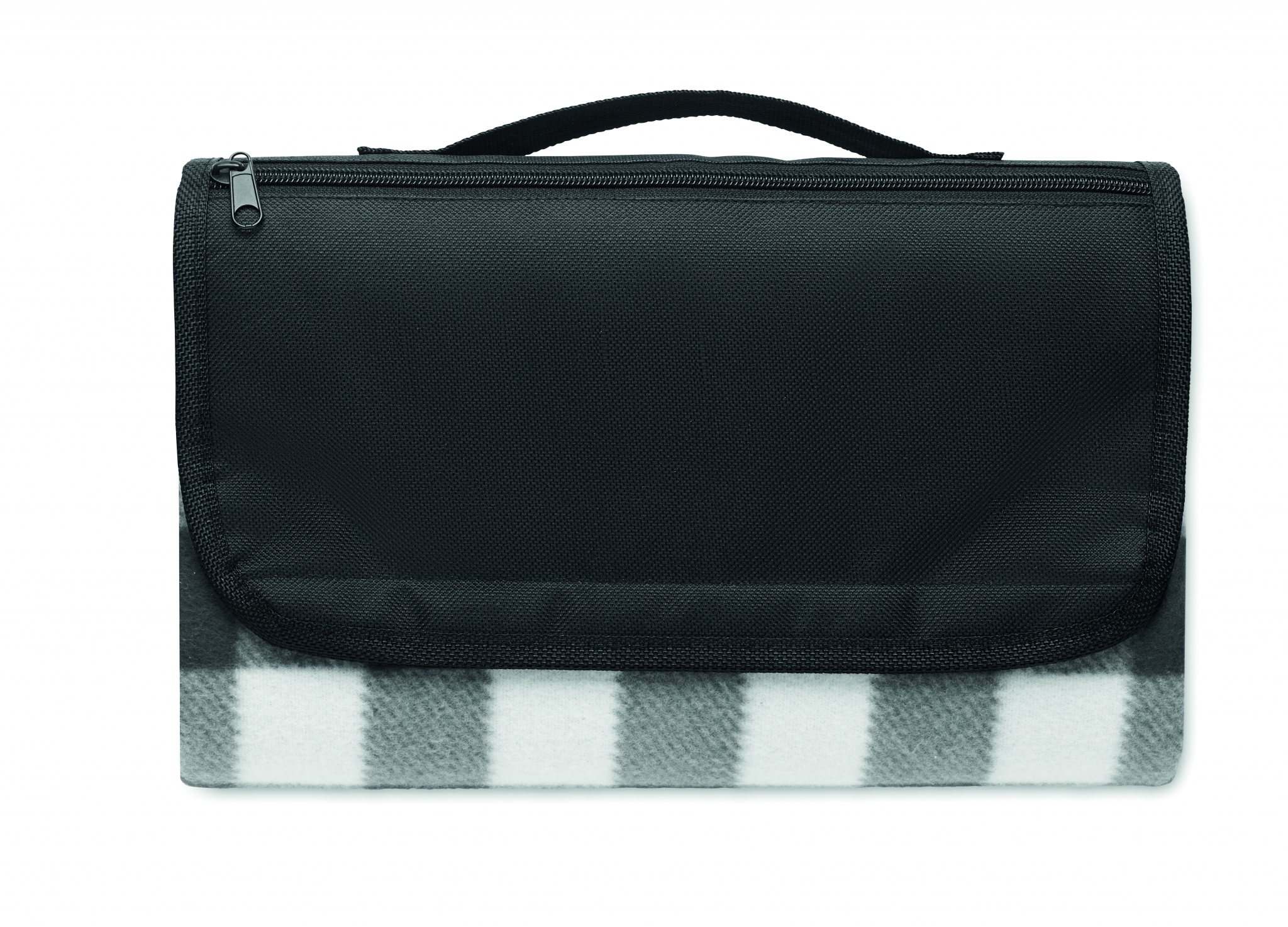 Складывающийся плед для пикника из флиса RPET 150 гр/м² с водостойким покрытием PEVA с обратной стороны. Включает передний карман на молнии и короткий ремень для переноски.