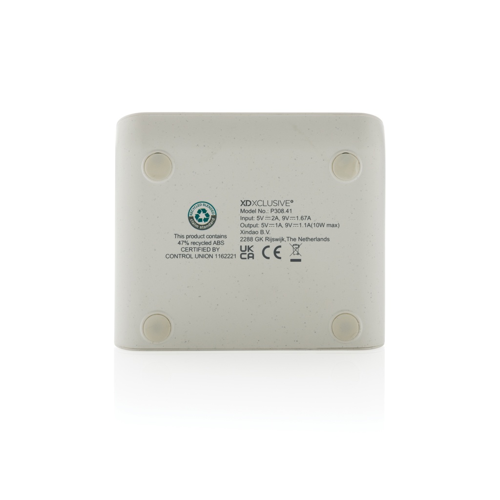 Быстрое беспроводное зарядное устройство мощностью 10 Вт из переработанного ABS-пластика, сертифицированного по стандарту RCS (Recycled Claim Standard). Общее содержание переработанных материалов: 47% от общего веса изделия. Сертификация RCS гарантирует полностью сертифицированную цепочку поставок переработанных материалов. Зона беспроводной зарядки Bamboo из бамбука FSC 100. С двумя портами USB на задней панели для зарядки через кабель. Подставка предназначена для зарядки телефона как в горизонтальном, так и в вертикальном положении. Идеально подходит для просмотра видео или другого контента во время зарядки. Беспроводная зарядка совместима с Android последних поколений, iPhone 8 и выше. Изделие и аксессуары не содержат ПВХ. В комплект входит кабель для зарядки типа C длиной 120 см из переработанного TPE, сертифицированного по стандарту RCS. Упаковано в коробку из крафт-бумаги FSC mix. Вход Type-C 5 В/2 А; 9 В/2 А; Беспроводной выход 5 В/1 А; 9 В/1,1 А; (10 Вт) Зарегистрированный дизайн®