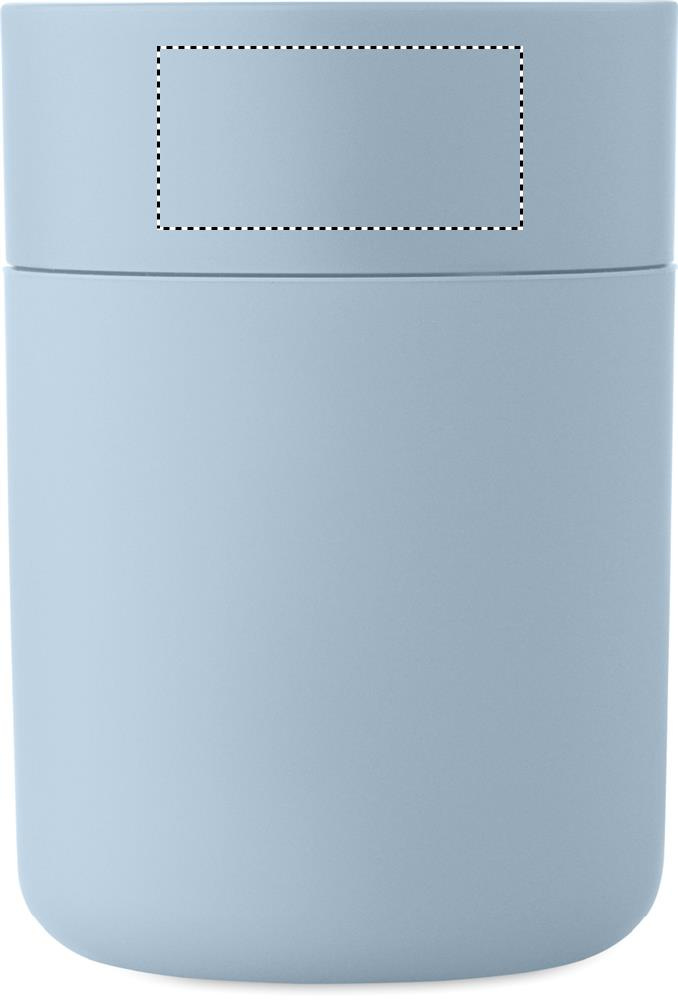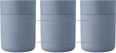 PP tumbler with silicone sleeve and PP sliding lid. Capacity: 330 ml. As this is a single walled mug, heat transfer can still occur.