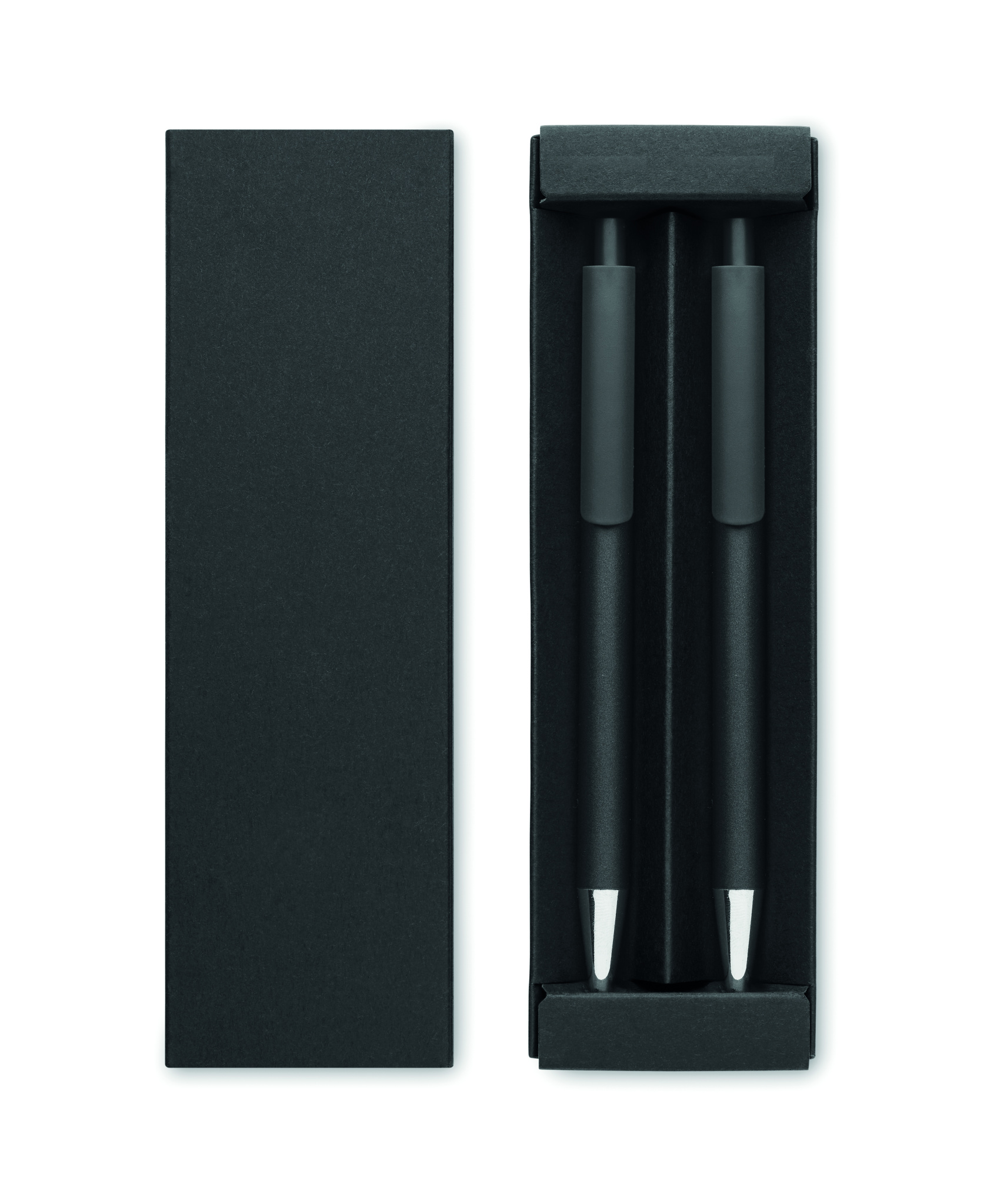 Recycled aluminium pen set with 1 push button ball pen and 1 graphite inkless pen. Blue ink. Presented in recycled paper box.