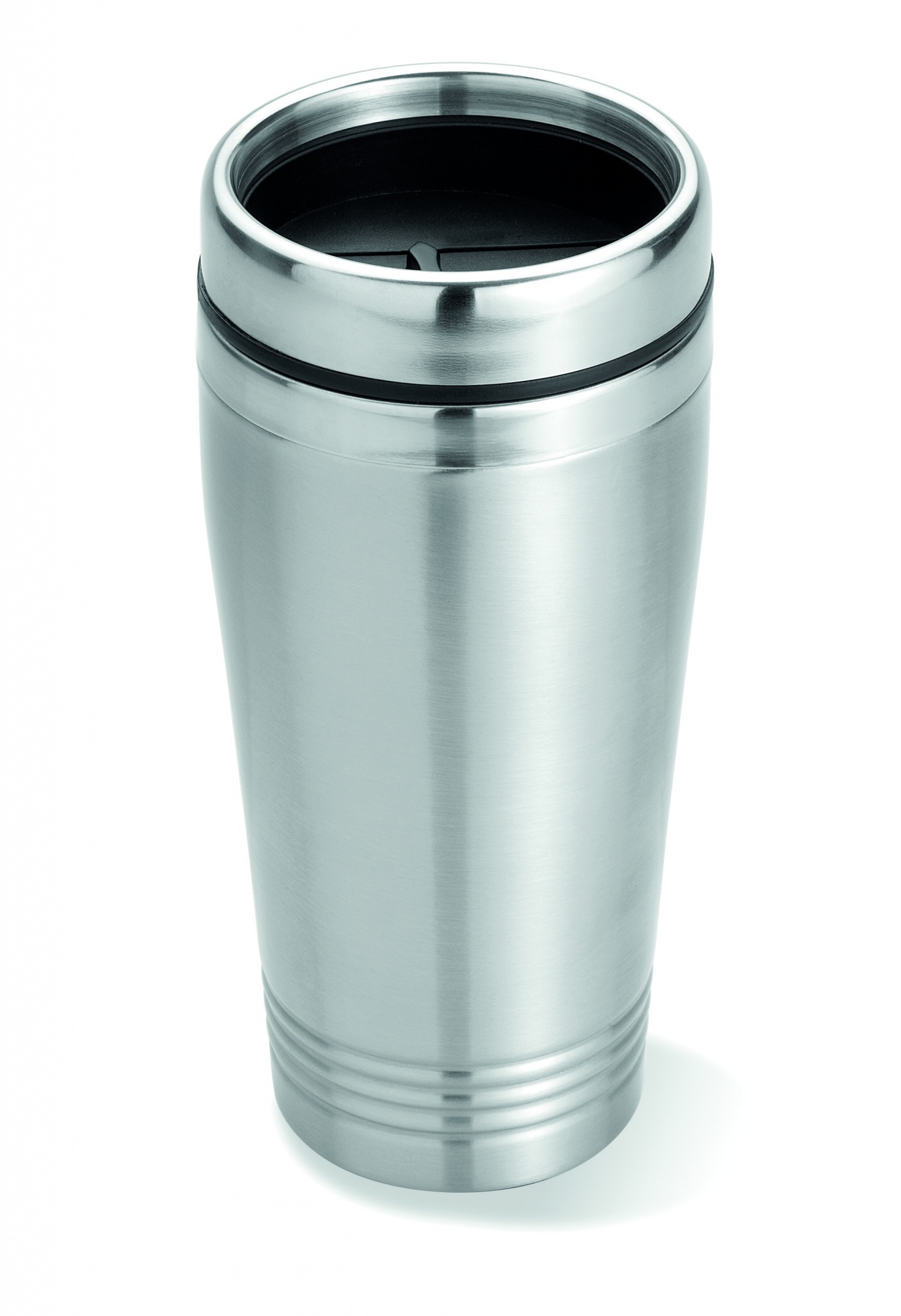 Термокружка с двойными стенками из нержавеющей стали с пластиковой крышкой.
