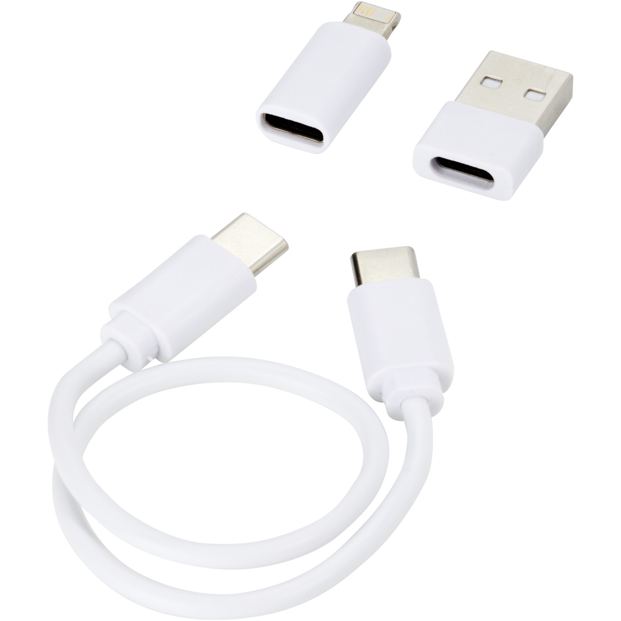 Модульный кабель для передачи данных и зарядки из переработанной пластмассы, поставляется в элегантной коробке для хранения. Кабель предлагает несколько решений для зарядки: Вход Type-C и USB-A, а также выход Type-C/iOS/micro USB. Благодаря всем этим адаптерам и разъемам данный кабель позволяет заряжать большинство смартфонов, камер, блоков питания, наушников и т. д. Кабель имеет максимальную выходную мощность 2 А. Имеет специальный штифт, который пригодится в любой момент, когда вам понадобится вынуть SIM-карту из телефона. В коробке для хранения также есть место для карты памяти micro SD и нано-SIM-карты, что делает ее идеальным аксессуаром для путешествий. Длина кабеля: 28 см. Поставляется в конверте из 100% крафт-бумаги вторичной переработки.