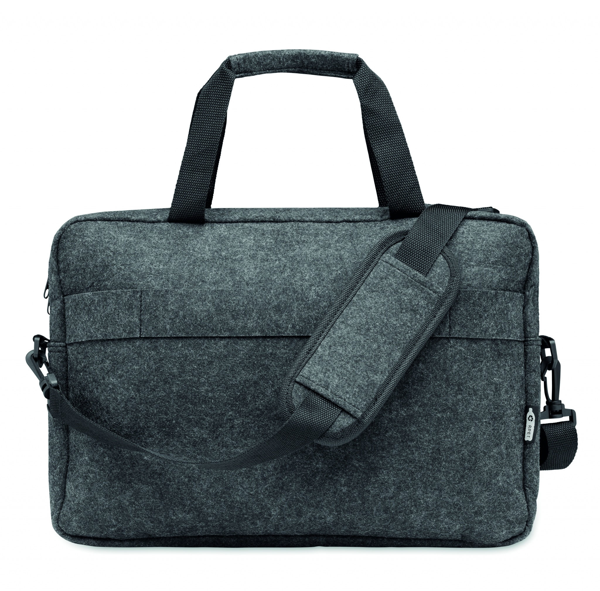 15-tums laptopväska i RPET-filt med ett invändigt huvudfack och en framficka med dragkedja. Med avtagbar och justerbar axelrem. Hållare för transportvagn på baksidan.