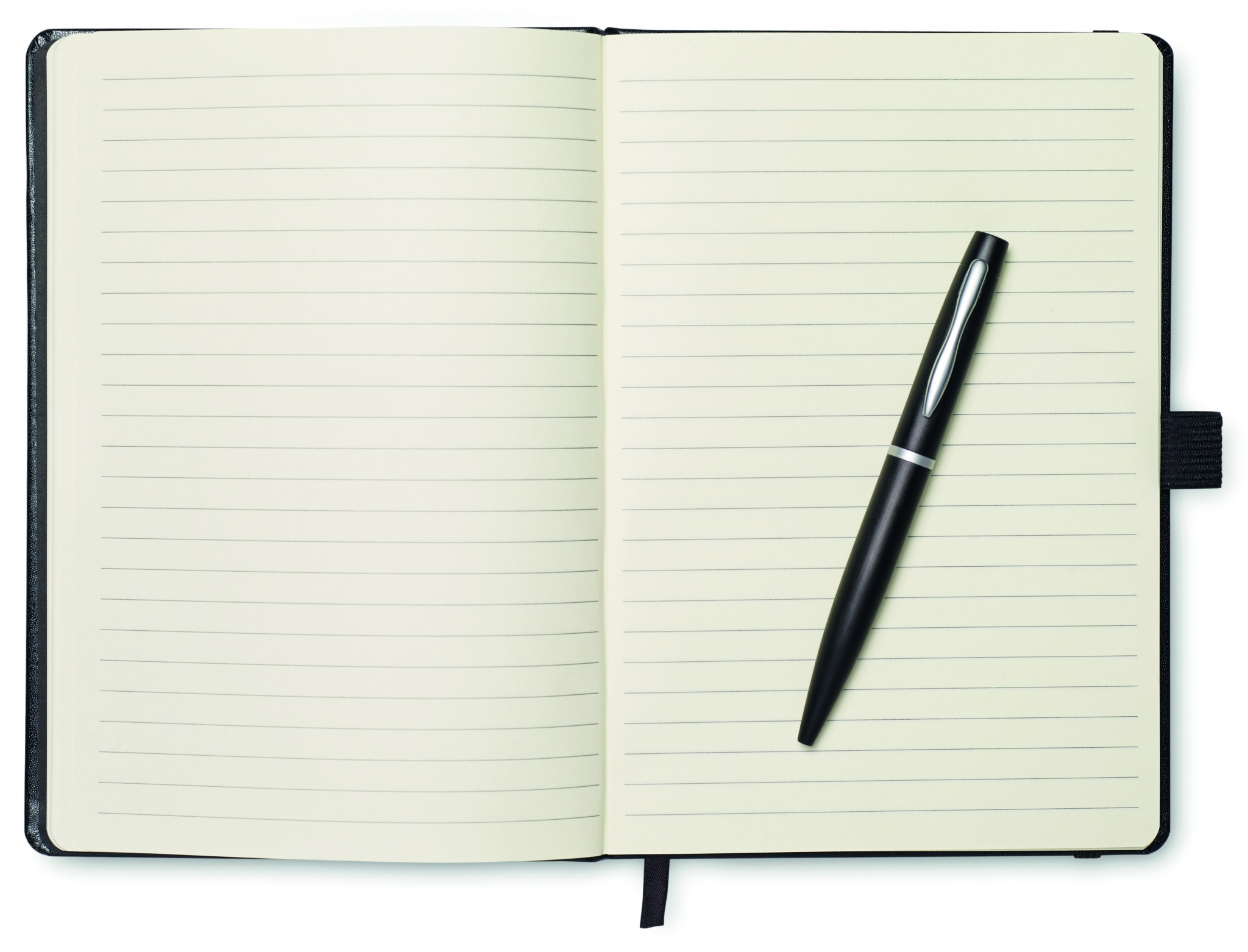 A5 inbunden anteckningsbok med hård pärm i PU, 72 blad linjerat papper, gummiögla och bokmärkesband i satin. Inklusive kulspetspenna i metall med blått bläck.