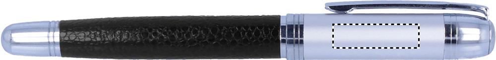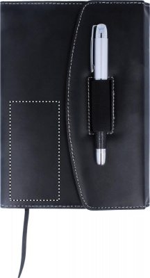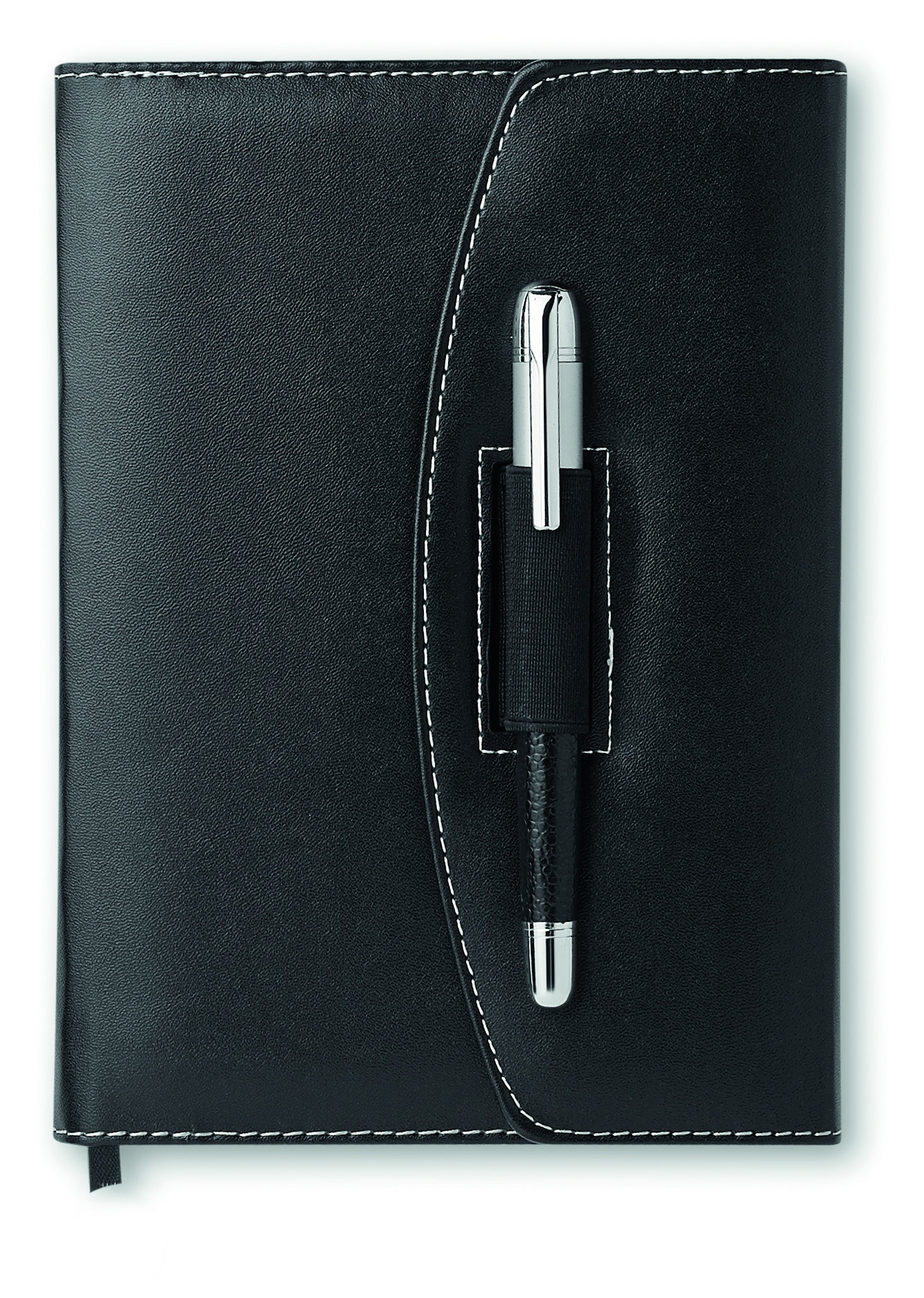A5 portfölj med kontrastsömmar. Med 120 sidigt linjerat block och metall penna. PU material. Svart bläck.