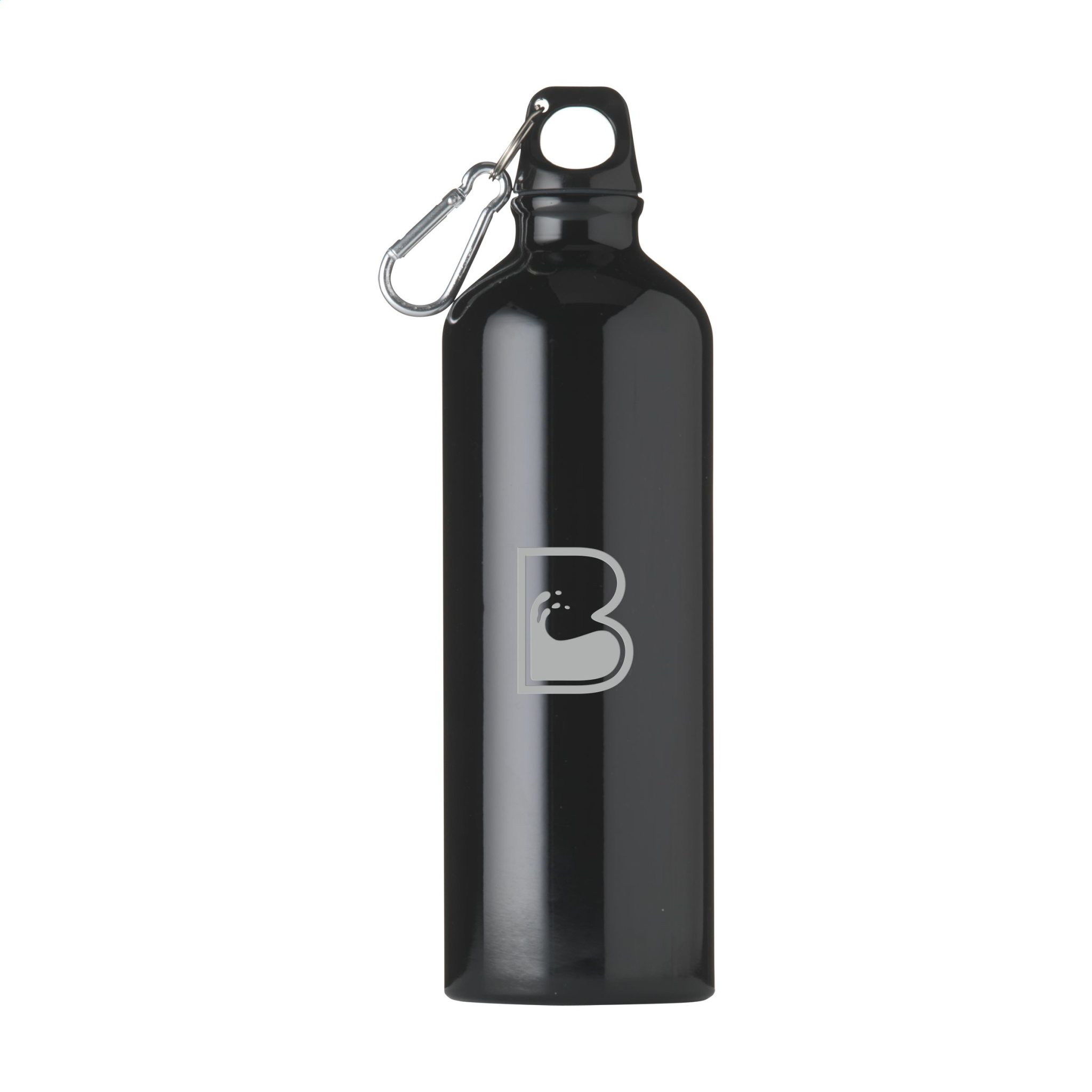 Enkelväggig vattenflaska i aluminium med högblank yta, plastskruvlock med nyckelring och metallkarbinhake. Karbinhaken får inte användas för klättring. Läcksäker. Kapacitet 750 ml.
