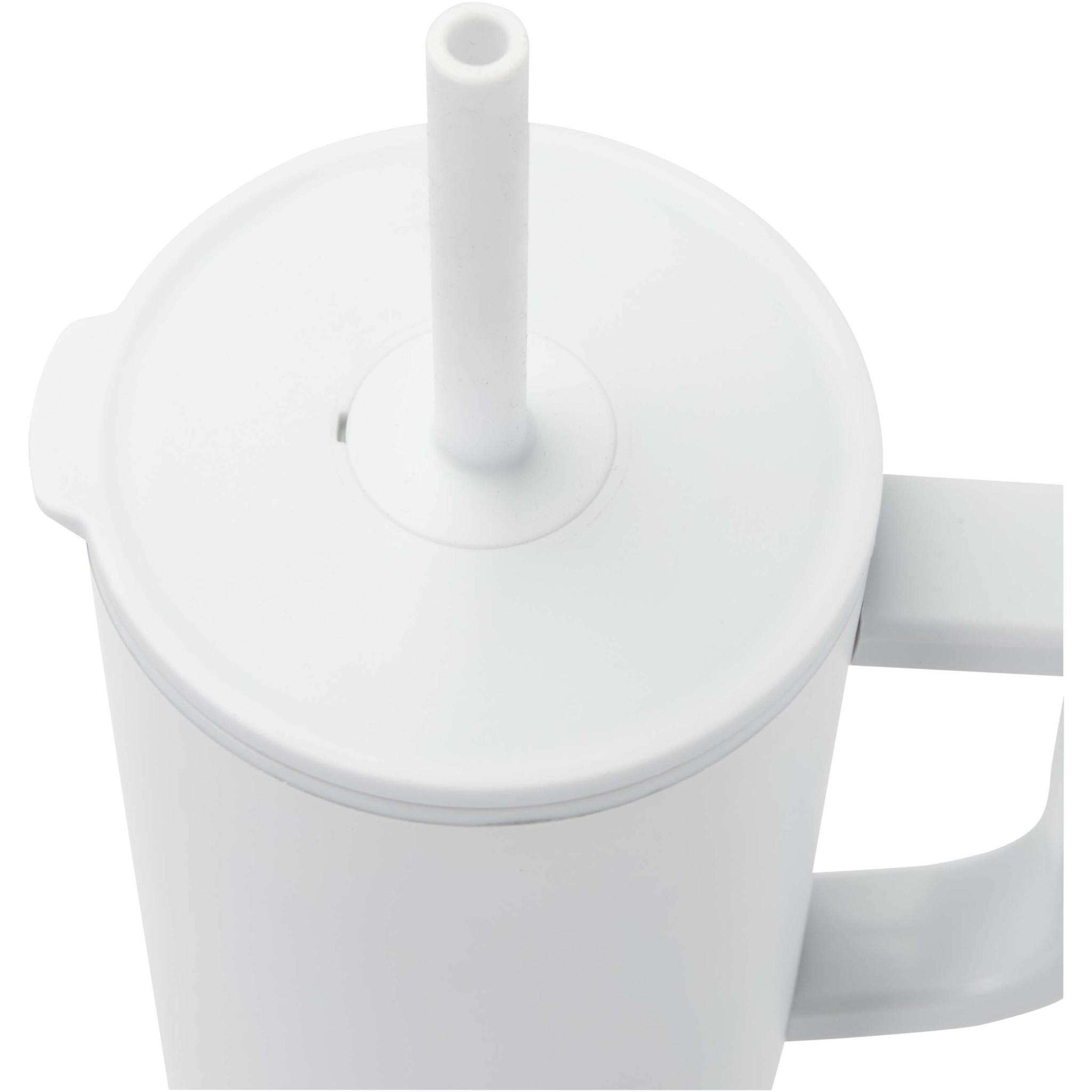 Termos med en slitstark yttervägg av RCS-certifierat återvunnet rostfritt stål och innervägg av plast. Den har ett integrerat sugrör i silikon av livsmedelskvalitet och ett stänksäkert trycklock för en smidig drickupplevelse. Denna termos är också lämplig för varma drycker, men det rekommenderas inte att dricka dem med hjälp av sugröret. För att låta din dryck svalna, ta av locket innan du förtär den. Volymkapacitet: 900 ml. Endast handdisk.