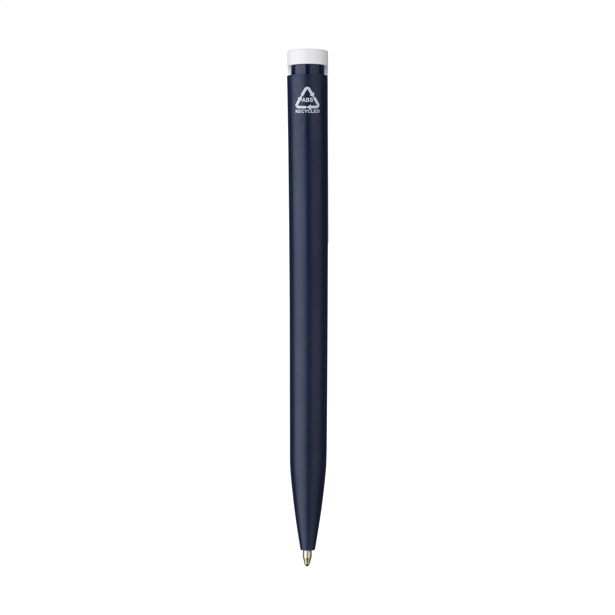 Kulspetspenna med blå bläckpenna gjord av återvunnen ABS. Kläm-/tryckknappen på denna penna har en slående färgaccent och erbjuder utrymme för ett generöst, digitalt fullfärgstryck. GRS-certifierad. Totalt återvunnet material: 85 %.