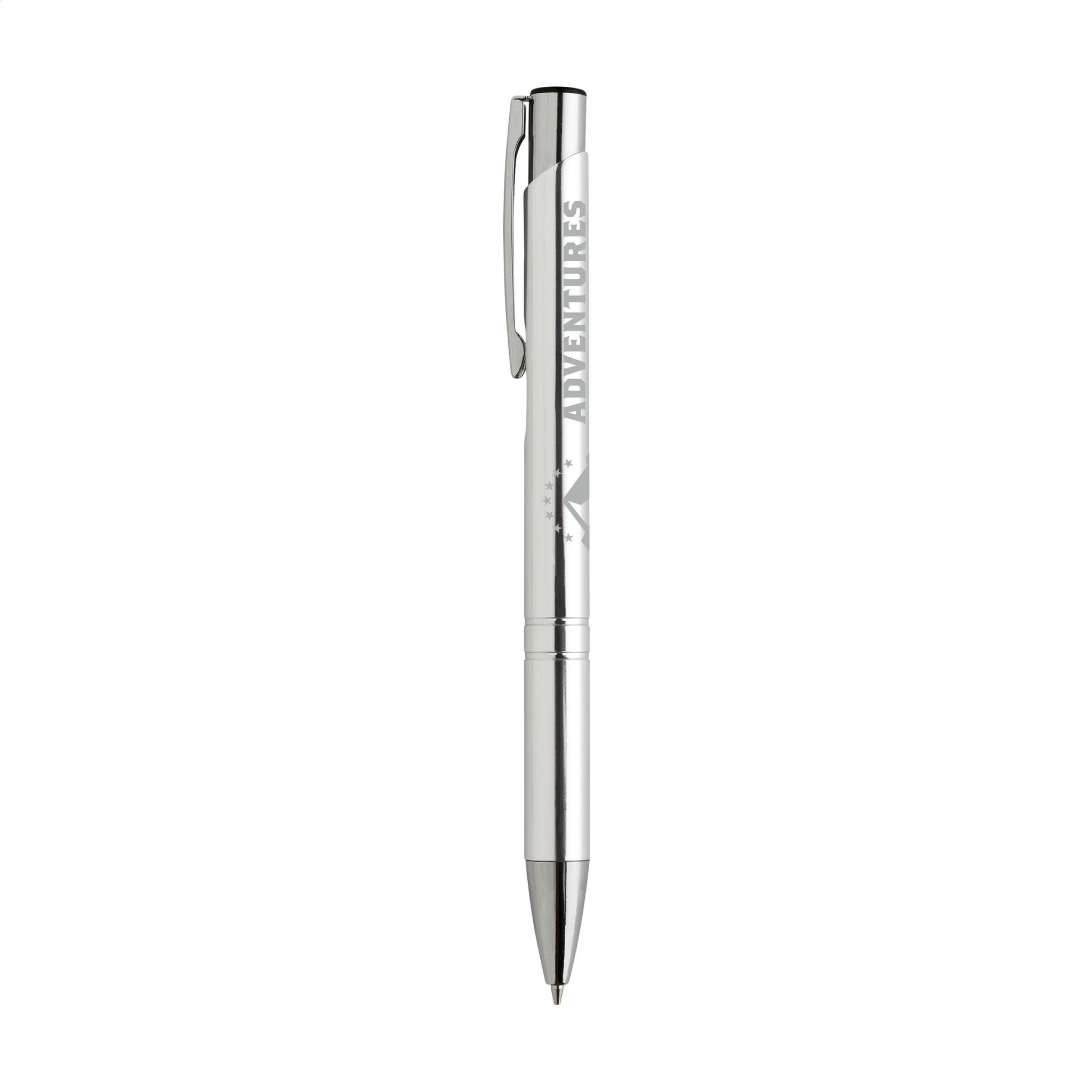 Blått bläck, kulspetspenna i aluminium med glänsande, metalliskt utseende cylinder och metallklämma.
