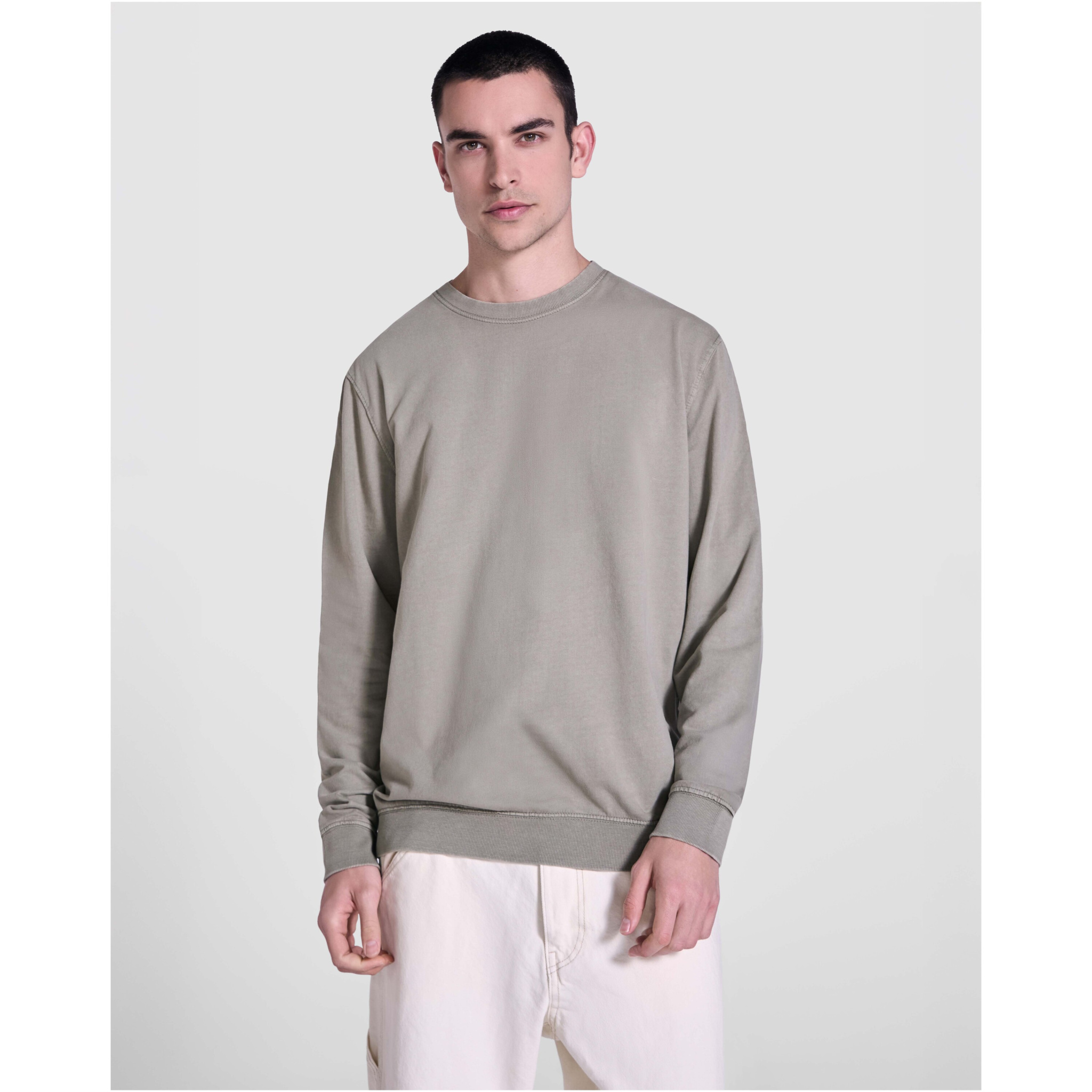 Unisex-tröja med syra-tvättad-finish. 2 x 1 ribbad krage, manschetter och nederkant i ton i ton. Förstärkta sömmar i manschetter, fåll, midjeband och ärmhål. Ton-i-ton täckstygn i nacken.