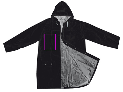 Vändbar PVC-regnjacka med huva, två fickor och tryckknappar. Pälsens baksida - 103 x 60 cm.