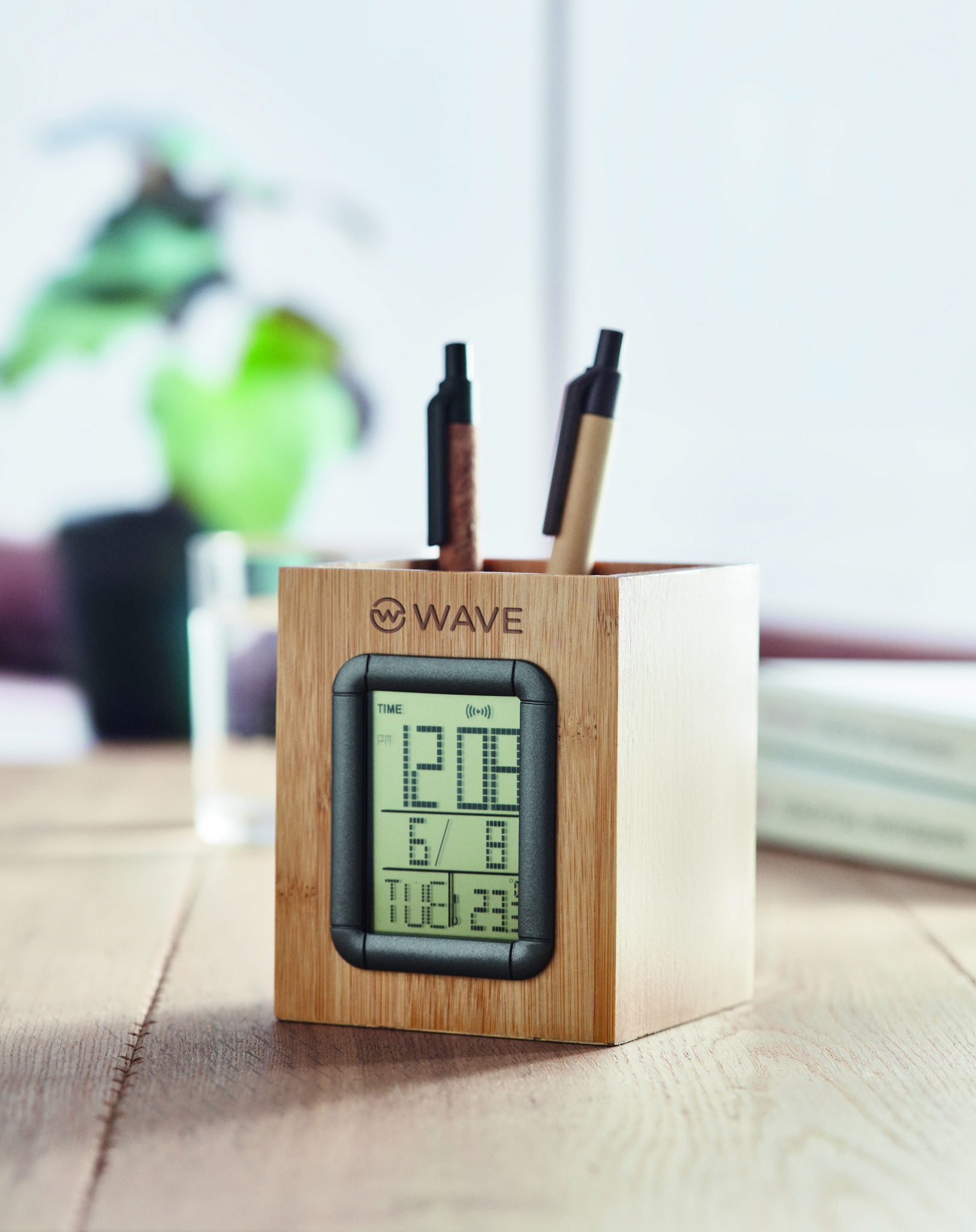 Logotrade kampanjprodukter bild: Pennhållare bambu LCD klocka