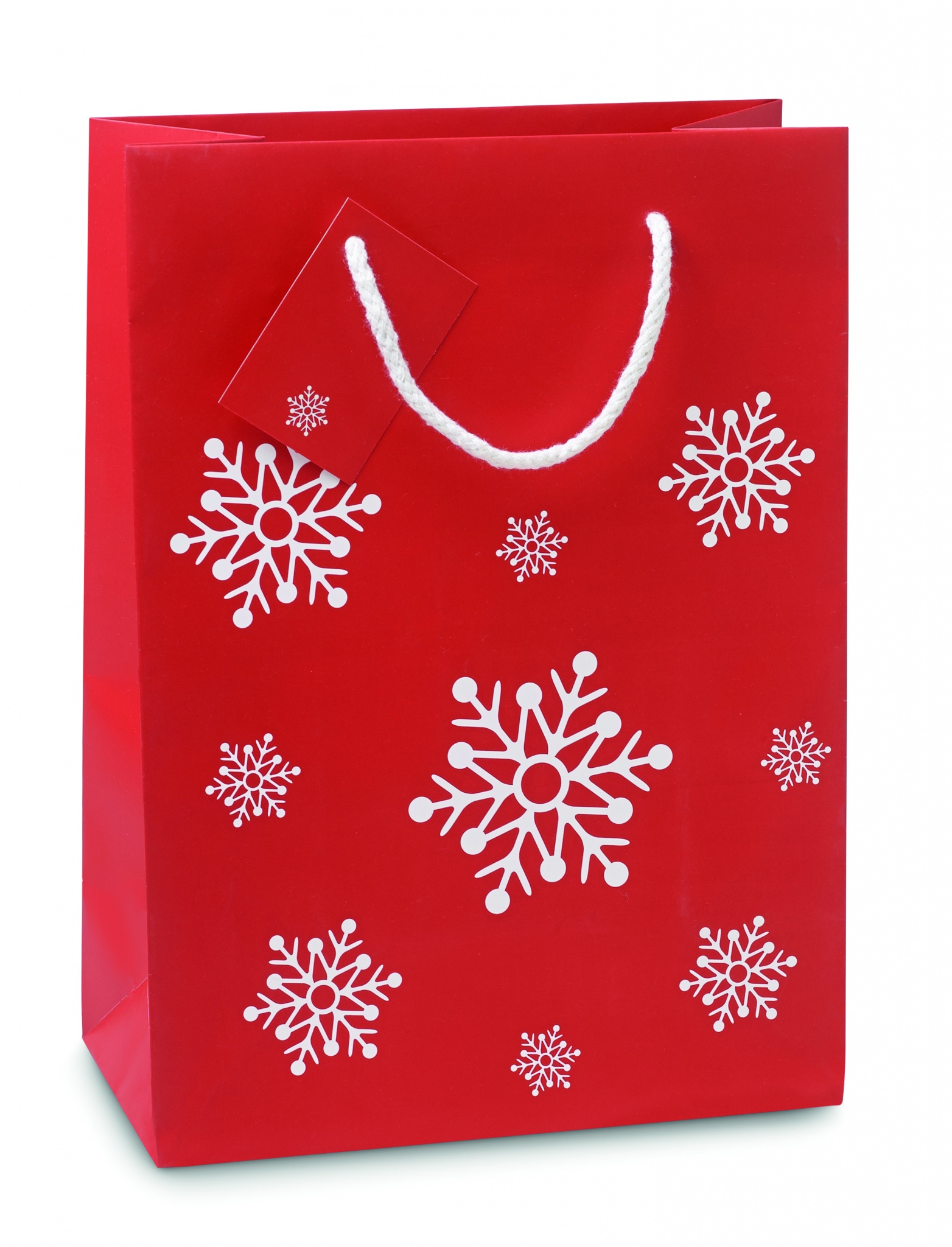 Elegant papperspåse med snöflingor mönster. Presenthälsningskort på handtaget. 30 cm hög.
