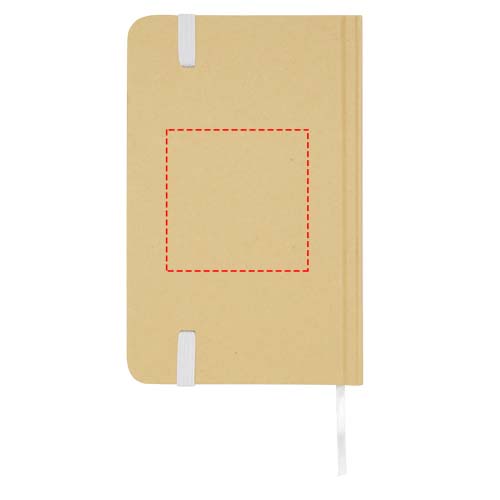 Reed A6 inbunden anteckningsbok av återvunnen kartong med rundade hörn är inte bara oumbärlig på kontoret utan dessutom ett utmärkt tillfälle att marknadsföra ditt varumärke. Anteckningsboken har 96 blanka ark med 70 g/m 2 papper och ett omslag med mjuk känsla. Levereras med elastisk förslutning och ett bokmärke.