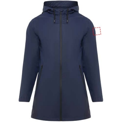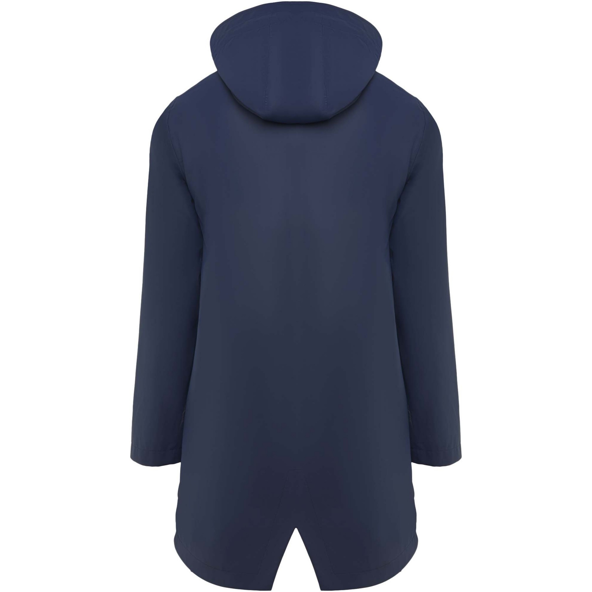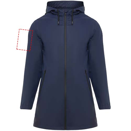 Vattentät regnjacka för dam. Huva med topp. Värmeförseglade dragkedjor och sömmar. Kontrasterande detaljer i svart. Två sidfickor med dragkedja. Slits i bakre fållen. Borttagbar etikett. Vattentät. Modellen är 179 cm och bär storlek S.