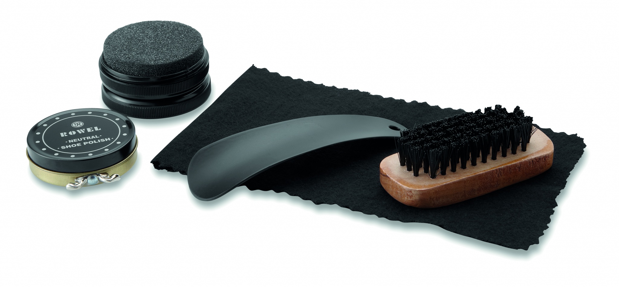 5 dels lyxiga skoputs set i presentförpackning. Setet innehåller en svart putsduk, svart skohorn, borste, skosvamp och ett polermedel i en neutral färg.