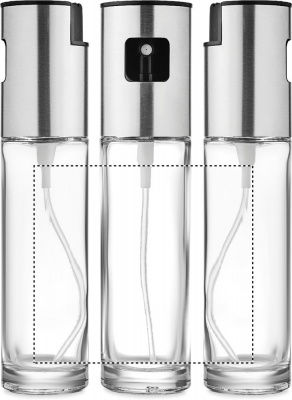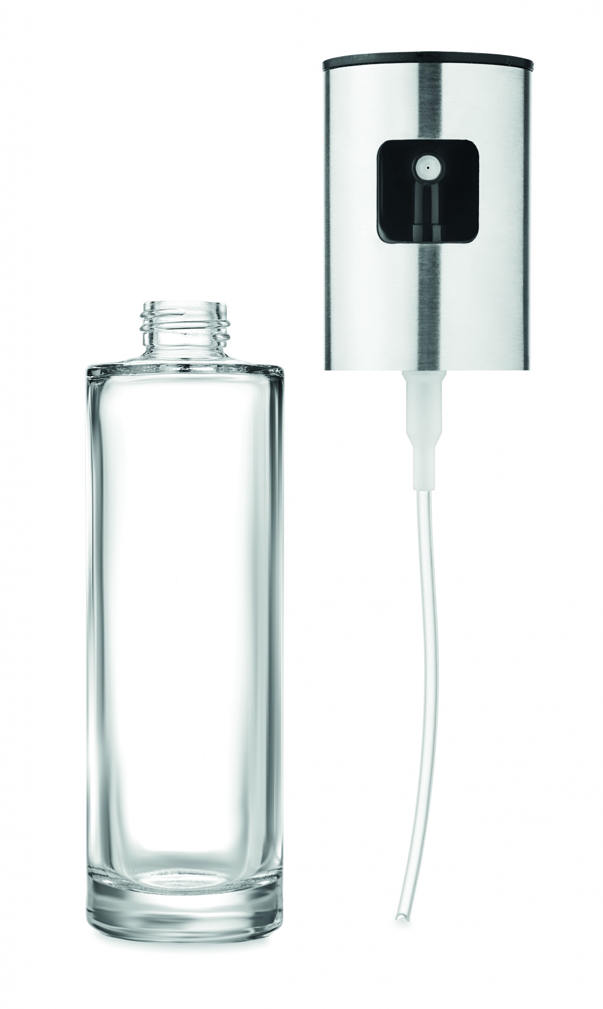 Sprayflaska i glas med och lock i rostfritt stål för matolja. Ger jämn sprayfilm på sallad eller stekpanna . Kapacitet: 100 ml.