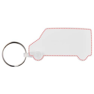 Vit minibussformad nyckelring med delad nyckelring i metall. Metallringen har en platt profil som är idealisk för utskick.