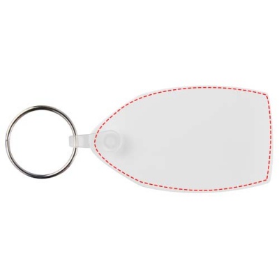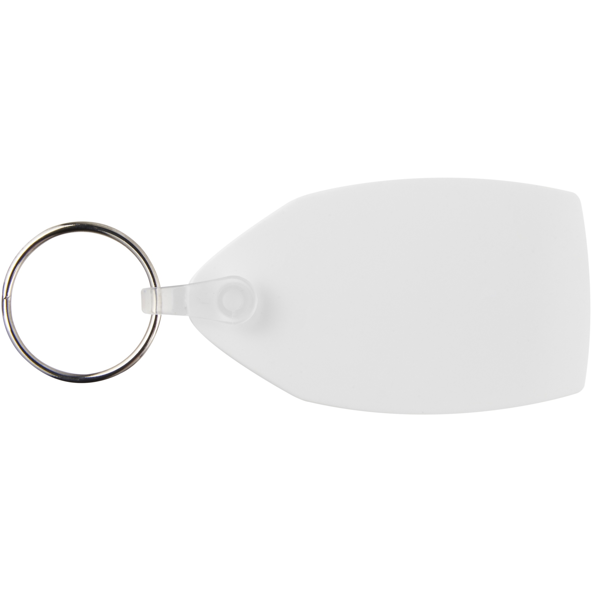 Vit rektangulär nyckelring med delad nyckelring i metall. Metallringen har en platt profil som är idealisk för utskick.