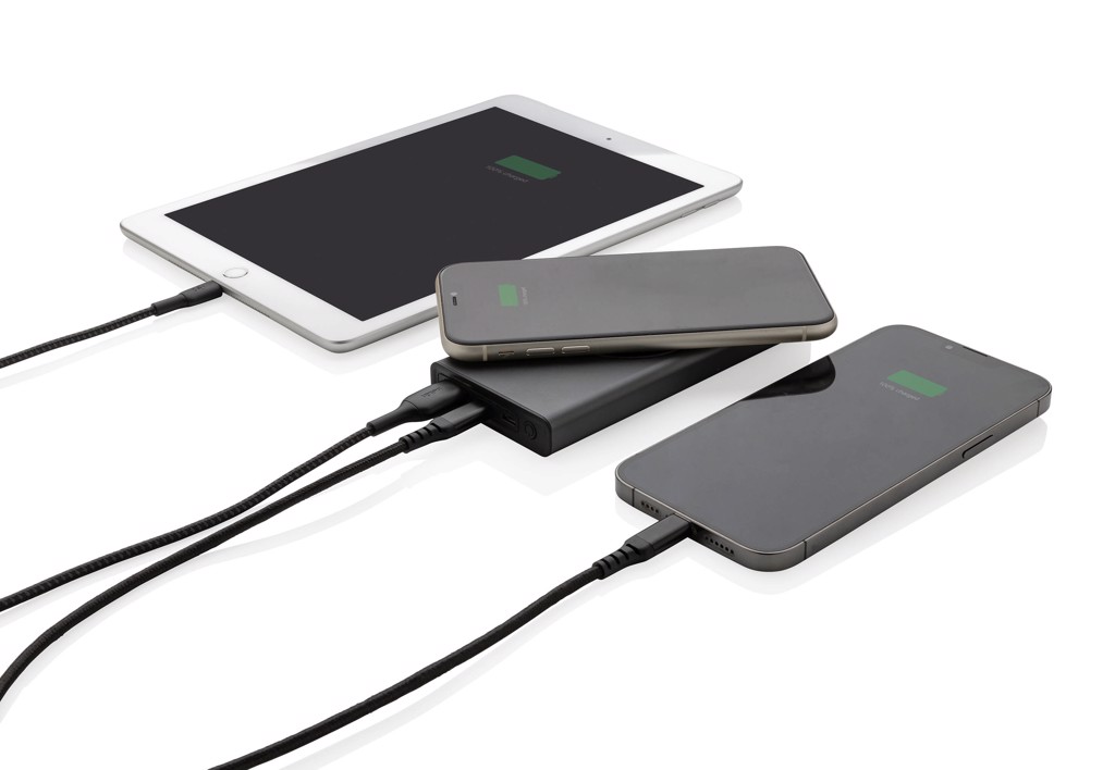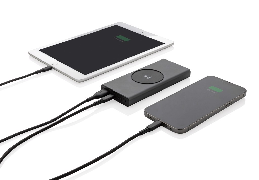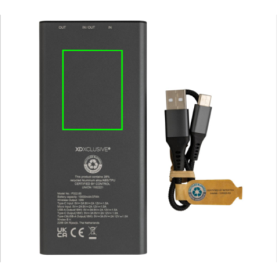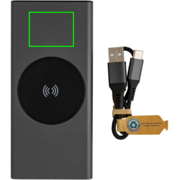 Ultrasnabb powerbank tillverkad av RCS (Recycled Claim Standard) certifierad återvunnen aluminium och ABS. Totalt återvunnet innehåll: 28% baserat på total produktvikt. RCS certifiering säkerställer en helt certifierad leveranskedja av de återvunna materialen. Aluminium förlorar inte sina egenskaper i återvinningsprocessen och kan återvinnas i det oändliga. Powerbanken har ett långvarigt A-graderat 10.000 mAh lithium polymer batteri. C output porten stödjer snabbladdning upp till 18W samt snabb återladdning inom 3 timmar. Den trådlösa laddningen stödjer trådlös laddning upp till 10W. Strömindikatorn visar energinivån så att du vet när det är dags att ladda på nytt. Produkt och accessoarer är 100% PVC-fria. Type C laddningskabel i RCS certifierad återvunnen aluminium, TPE och PET medföljer. Levereras i FSC® mix förpackning. USB output 5/3A, 9V/2A. 12V/1.5A. Type C output: 5V/3A, 9V/2A, 12V/1.5A. Type C input: 5V/3A, 9V/2A, 12V/1.5A. Micro USB input: 5V/2A, 9V/2A, 12V/1.5A.