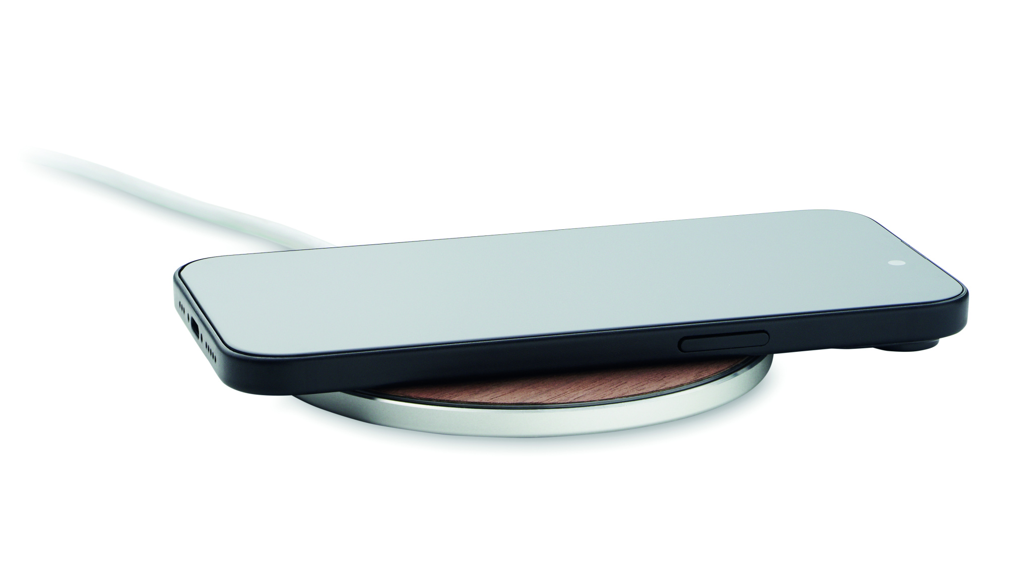Trådlös laddare i återvunnen aluminium med toppdetaljer i valnöt. Anslut enheten till din dator eller laddare, placera din smartphone på den och låt den ladda. Utgång: DC 9V/1,67A (15W). Kompatibel med alla QI-aktiverade enheter, t.ex. senaste Android, iPhone® 8, X och nyare.