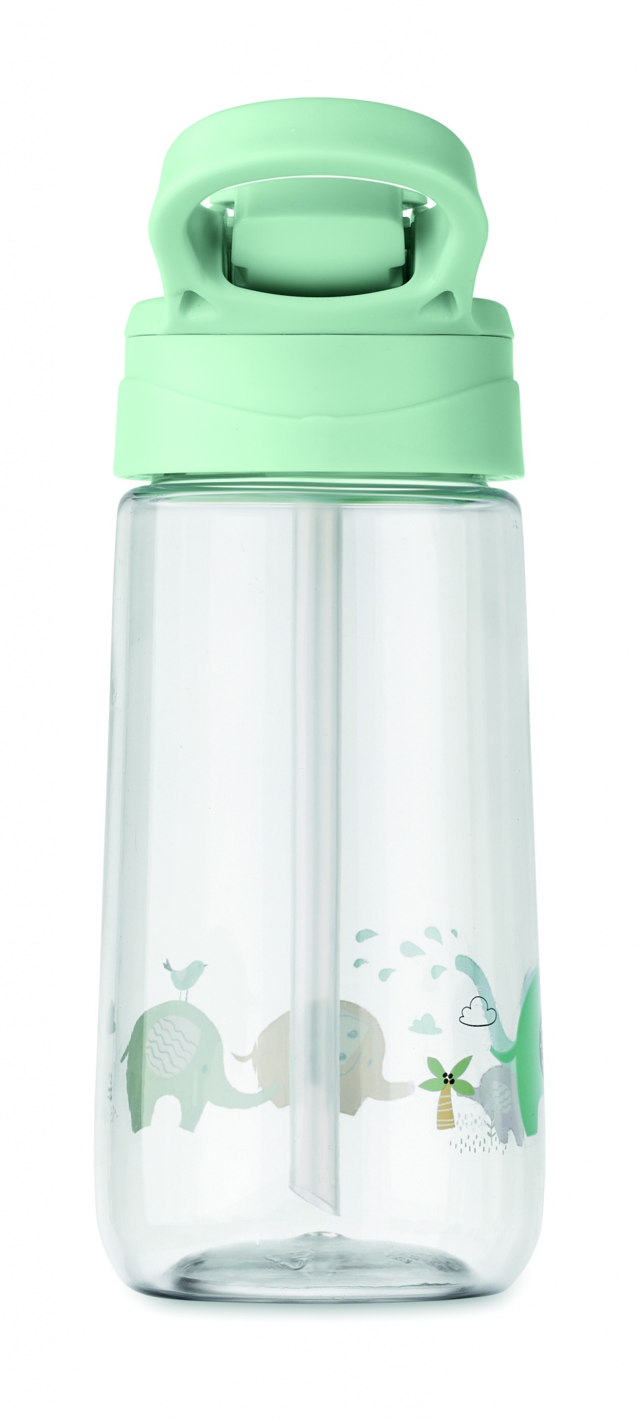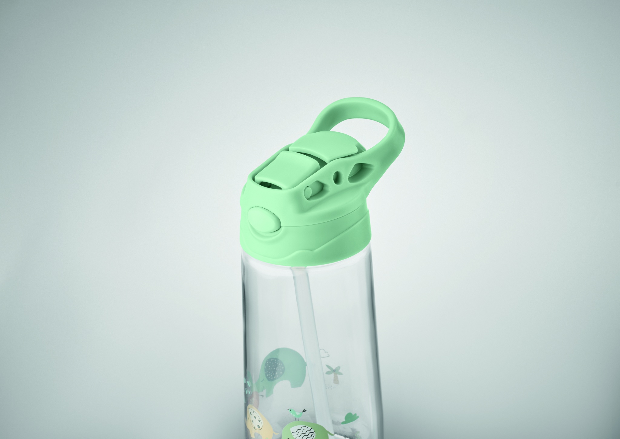 Flaska för barn i tritan med inbyggt sugrörslock. Mönster tryck på flaskans nedre del. Läckagefri. Kapacitet: 450 ml.